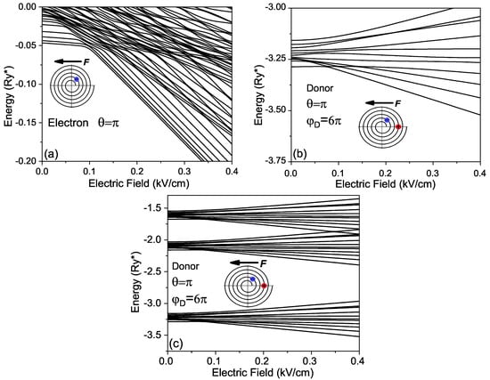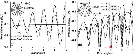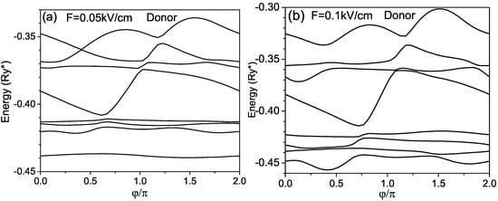 The Stark effect in donors confined in the RUQW is not only nonlinear but also is anisotropic, i.e., the shifting and splitting of energy levels depend not only on the value of the external field but also on its direction. It is related to the spiral’s geometry, in which the separation between adjacent wings at each point depends not only on the point position but also on the direction. Finally, in Figure 7, we present the energies of the donor as a function of the angle between the electric field direction and X axis. It is seen that for a weak electric field, as the donor dipole moment is small, the lower energies in Figure 7a almost do not depend on the electric field orientation because these states are strongly bound to the donor. The behavior of the lower levels in Figure 7b is essentially changed, as the electric field is equal to kV/cm and the electron–donor separation is large according to the results presented in Figure 6a. The energies of the ground and of first excited states become sensitive to the orientation of the electric field in contrast to the corresponding dependencies in Figure 7a.