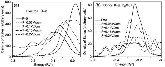 In Figure 5, we show curves of the DOS for different values of the electric field for the electron and donor. In both cases, one can observe a consecutive broadening of the principal peak of the DOS with increasing the electric field. However, for the donor, this broadening is almost symmetrical in contrast to the electron, for which the broadening of the peak is accompanied by its shifting to the red end of the spectrum. In addition, in the case of the electron, the increase of the electric field induces the fine structure in the curve of the DOS.