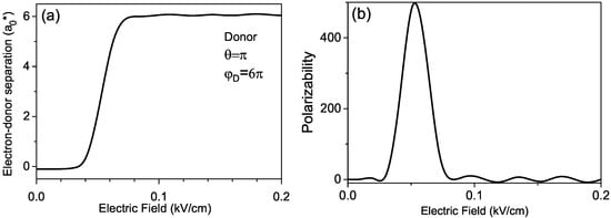 In Figure 6a, we display the plot of the averaged separation between the electron and donor as a function of the external electric field F. One can see that with an increase in the electric field above the value of kV/cm, the averaged electron–donor separation begins to increase sharply until it reaches the largest value for the electric field of kV/cm. We attribute such dependence of the dipole moment to a rather sharp change in the configuration of the ground state of the donor.