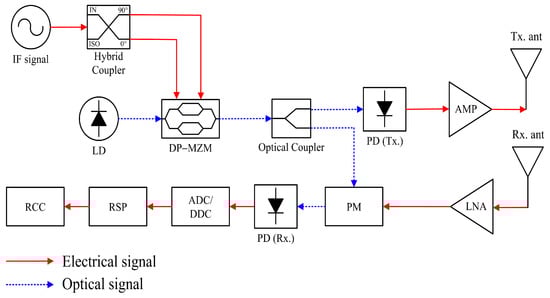 As the integration of low-probability of intercept (LPI) technology into unmanned aerial vehicle (UAV) gradually increases with the development of relevant technologies [1,2,3], the demand for research to prevent the threats posed for these aircraft is growing [4], and to detect the target in advance is of paramount importance. However, the detection of LPI targets, which are small and have low radar cross-sections (RCS), is difficult when using conventional radar systems. A radar transceiver system using photonics technology has recently attracted attention as a fundamental solution to the LPI target detection issue by using the capability of wideband signal generation [5]. Microwave photonic radar technology has some advantages in low-frequency-dependent loss and wideband frequency characteristics, and this technology has been adopted for obtaining high-frequency signals for signal processing using photonics elements. In [6], a photonic-based phased array radar architecture is proposed to obtain the target image through digital beamforming. Moreover, various studies have been conducted including increase in detection range [7,8], use of high-frequency bands for low-RCS target detection [9,10,11]. In addition, there have been substantial efforts to implement various systems using microwave photonics technology for high-resolution images [12,13,14,15]. For example, in [14], a linearly chirped microwave generator using photonic elements was introduced for SAR systems with large-range resolution demand, such as Earth surveillance and monitoring. In [15], the use of photonic generation and transmission of linearly chirped microwave waveform was examined for modern radar systems.