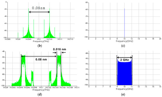 The signal generation simulation has been also conducted for the LFM signal which will be applied in the proposed system. Figure 2d,e present the simulation results from the OSA and the ESA, respectively, when the input IF LFM signal has 500 MHz bandwidth at 2.5 GHz center frequency. The results demonstrate that the proposed transceiver can generate a quadrupled signal while the fundamental optical carrier and two first-order sidebands are suppressed.