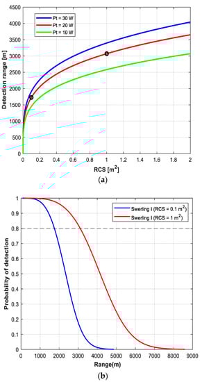 (a) Detection range versus RCS plot with changes in transmission power. (b) Detection probability versus range plot with changes in RCS.