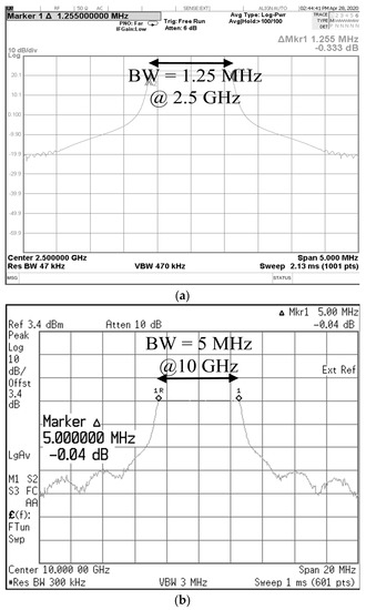 Figure 4 shows the signal generated in the transmission path; that is, the input signal to Tx. The center frequency and bandwidth of the initial IF signal are 2.5 GHz and 1.25 MHz, respectively. The transmit signal applied to the antennas is centered at 10 GHz with a bandwidth of 5 MHz that is quadruple the value of that of the IF signal, and the result demonstrates that the proposed transceiver can achieve wideband characteristics using photonic elements.