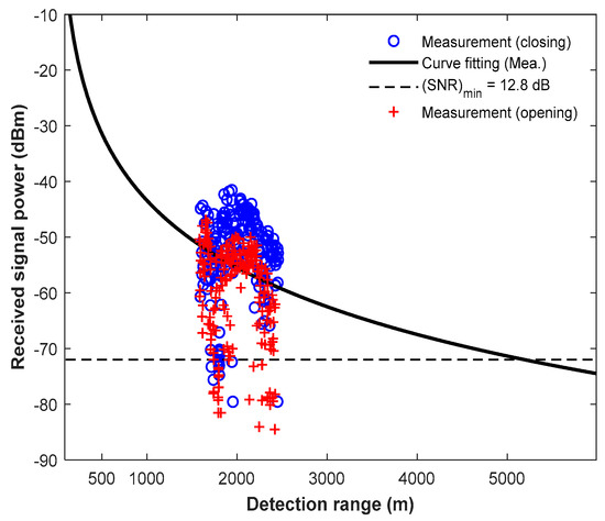 Received signal powers of closing and opening according to the detection range with curve fitting assuming a target RCS of 0.1 m2.
