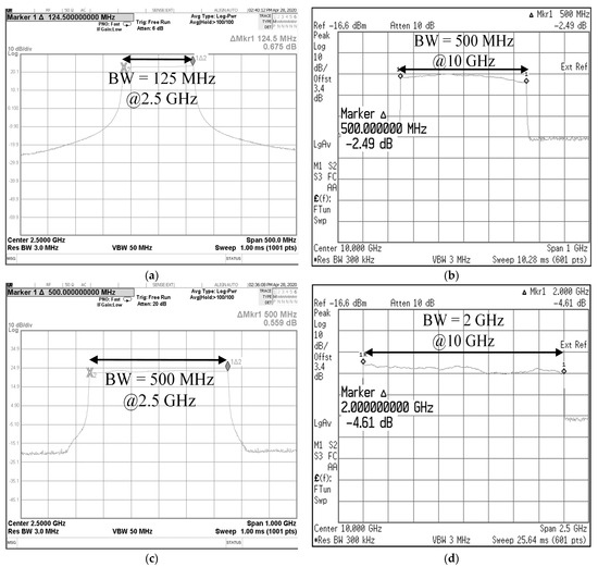 Measured (a) IF signal with 125 MHz bandwidth at 2.5 GHz center frequency and (b) quadruple the signal with 500 MHz bandwidth; (c) IF signal with 500 MHz bandwidth at 2.5 GHz center frequency and (d) quadruple the signal with 2 GHz bandwidth.