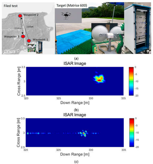 Figure 7 shows ISAR images for the drone target at 330 m distance using the proposed FMCW radar with photonic elements according to different bandwidths. Figure 7a shows the scenario for the field test with the measurement environment; the target (Matrice 600) has waypoints with waypoint 2 being 2.8 km away from the radar site with an altitude of 500 m. Figure 7b,c present ISAR images when the bandwidths of the proposed radar system are 500 MHz and 2 GHz, respectively. The range resolution of the proposed system can be improved from 2 m to 0.5 m when the bandwidth of the proposed radar system increases. The results show that the proposed radar system is capable of acquiring high-resolution ISAR images, and it is confirmed that the body and motors in the wing part of the drone are more visible at 2 GHz than at 500 MHz.