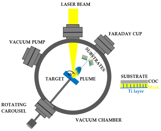 The Ti deposition of thin film on the surface of a COC matrix is carried out through the direct IR laser irradiation in repetition rate of a solid Ti target placed in the vacuum. Above the ablation threshold of the solid target, ionization is induced, and a bright-colored plasma is formed. Such a plume consists of electrons, ions, clusters and exhibits a stoichiometry similar to that of the laser-irradiated material. Results that the particles ejected at high energy from the laser generated plasma are collected on a substrate placed near to the solid target, as observed in Figure 2. The COC was covered with a metallic mask with a thickness of about 1 mm and designed with an array of squares with a lateral size of about 80 μm × 80 μm (see Figure 3).