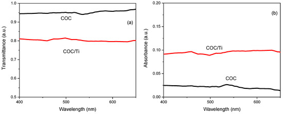 The optical modification induced in the COC foil after the PLD processing has been estimated through the comparison of the original transmittance (see Figure 5a) and absorbance (see Figure 5b) in pristine and Ti-covered COC.