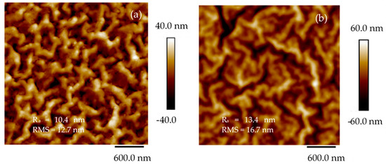 The AFM data, derived from an average of four scans from different areas on the films, yield an RMS roughness of 12.7 nm (see Figure 6a) on the pristine COC and 16.7 nm (see Figure 6b) on the Ti/COC deposited by laser ablation.