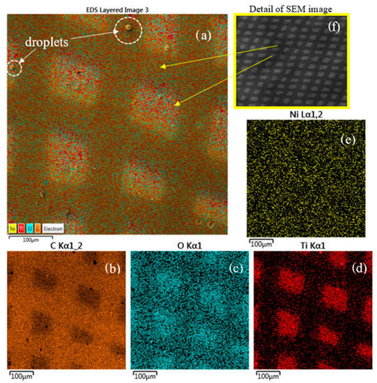The circular structures located on the surface of the deposited COC and marked by dashed white color are a doplets phase of Ti emitted from the laser plume and deposited on the surface. A detailed SEM image of the pattern with a wide field of 4.77 mm and 44 X magnification is shown in Figure 8e for a better visualization of the pattern displayed in the SEM-EDX (see Figure 8a–e).