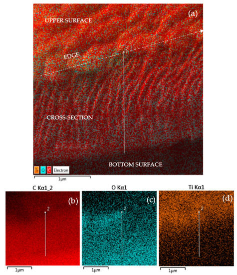 COC foil deposited with Ti has been transversally cut and placed at a planar angle for a simultaneous display of the surface and cross-section. In Figure 9 have been marked, in white color, the upper surface, the cross section and the bottom surface to assist the visualization. Figure 9 shows the maps indicating the presence of C (see Figure 9b), O (see Figure 9c) and Ti (see Figure 9d) Kα lines provided by the energy dispersive X-ray coupled to SEM. It seems that both C and O are more pronounced inside the cross-section, whereas Ti is distinct at the surface and slightly fades in the first layers of the cross-section due to the nuclear stopping power of the low energy Ti ions in the COC foil.