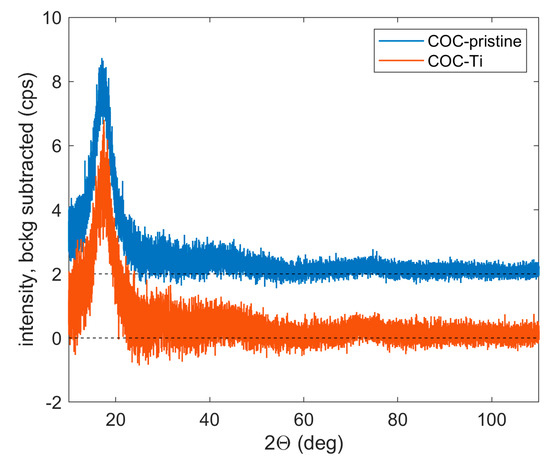 The XRD curves displayed in Figure 10 are referred to as the pristine COC and the COC deposited with a very thin layer of Ti by PLD. The curves of both samples are almost identical; the broad peak at approx. 17.0 ° can be ascribed to amorphous COC. The absence of the Ti signal can be explained by a very low thickness of the deposited layer.
