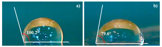 Contact angle for virgin COC (a) and for COC deposited with Ti ions (b).
