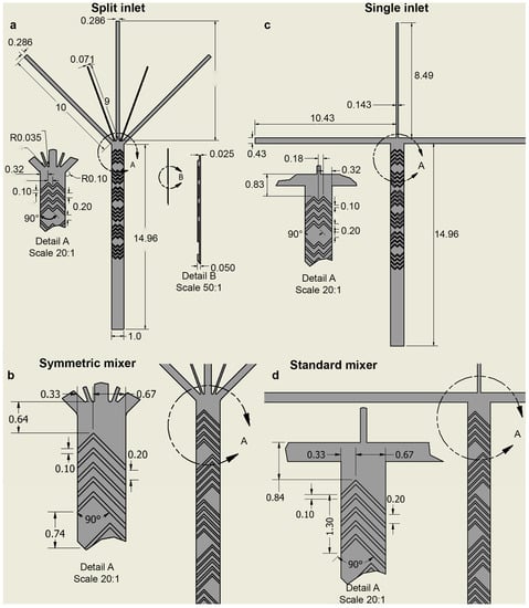 Design schematics of the “Symmetric mixer” geometry and inlet array used to create the tested microfluidic devices. The MAGS device included (a) the novel split inlet design and “Symmetric mixer” geometries and was compared to (b) a “Standard mixer” geometry for mixing efficiency. Single inlet versions for (c) the “Symmetric” and (d) “Standard mixer” geometries were compared to the split inlet design. All dimensions shown in millimeters.