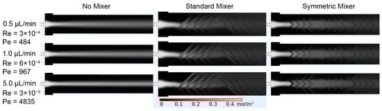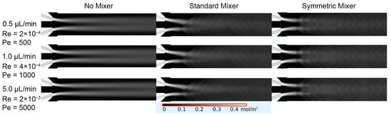 COMSOL generated fluorescein concentration profiles for the single inlet designs of No Mixer, Standard Mixer, and Symmetric Mixer simulations, at 0.5, 1.0, and 5.0 μL/min. Average Re and Pe values were calculated after the last set of mixers in the main channel (x = 10,000 μm) and reported under the corresponding flow rates.