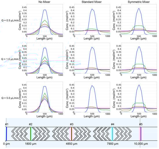 Concentration plots (Figure 6) along the main channel validated the visual observations (Figure 5). As seen in the single inlet design, both micromixer geometries improved mixing within short distances down the main channel. The “Standard Mixer” design, however, resulted in a non-uniform distribution of channel concentrations. The “Symmetric Mixer” design showed similar mixing performance, compared to the “Standard Mixer” design, but maintained a homogenous channel concentration profile. All designs showed similar concentration profiles at cut-line #1, the entrance area prior to mixers, but the “Symmetric Mixer” and “Standard Mixer” designs had more distributed concentration profiles for cut lines #2–5 when compared to the “No Mixer” design. The calculated Re and Pe numbers were slightly increased, but comparable to the single inlet design (Figure 3), they showed no change with the introduction of passive mixers and were positively correlated to the flow rates. Re numbers were all <0.002 and Pe numbers were >>1.