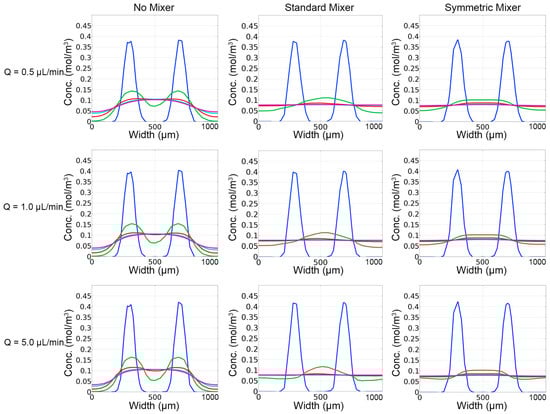 Concentration values were calculated at different cut lines along the main channel of the single inlet designs (Figure 4). These results align with the visual observations made from concentration profiles (Figure 3). Diffusion occurred in the “No Mixer” case, with none of the flow conditions resulting in uniform distributions across the channel width. As the flow rate increased, the concentration curves narrowed, which was also observed in the concentration profiles (Figure 4). Introduction of the micromixer geometries resulted in increased fluorescein distribution at cut lines 2–5 when compared to the “No Mixer” case, and a homogenous concentration of ~0.06 mol/m3. Due to the single sperm inlet, the “Standard Mixer” produced more diffusion along the channel when compared to the “Symmetric Mixer” case, which was also observed in the concentration profiles. Cut line 1 was similar across all tested designs, with the peak concentration increasing directly with the flow rate. The Reynolds (Re) numbers calculated for all flow rates simulated were <0.003, and Pèclet (Pe) numbers >>1, indicating mass transfer was convection-dominated rather than diffusion-dominated in these scenarios.