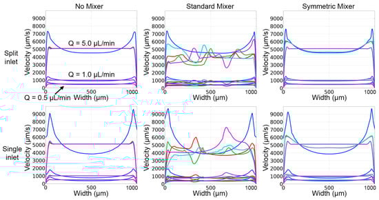 Because evaluating sperm motility in microfluidic channels can be more challenging when the velocity of the fluid in the viewing area of the channel is non-uniform, velocity profiles were compared for the inlet and mixer configurations. The devices with the split inlet channel configurations had similar velocity profiles in all evaluated flow rates (Figure 7). However, the “Symmetric Mixer” exhibited higher velocities near the walls for cut lines 2–4, while the “No Mixer” case did not. Both “Standard Mixer” designs, single or split inlets, had greater fluctuations in the velocity profiles (±1000 μm/s) for all simulations. However, the velocity ranges for all designs were similar (~4000–8000 μm/s for 5.0 μL/min, ~1000 μm/s for 1.0 μL/min, and ~500 μm/s for 0.5 μL/min).