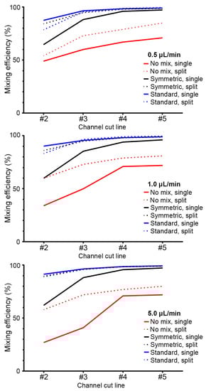 Mixing efficiencies were calculated using the COMSOL diffusion data for the three flow rates evaluated (Figure 8). As expected, mixing efficiency increased along the main channel, and the addition of micromixer geometries further increased mixing efficiency. This was more evident with the single inlet (~30–70%, depending on flow rate) when compared to the split inlet design (~60–80%, depending on flow rate). Splitting the sperm inlet increased efficiencies for all evaluated designs and flow rates (5–31% increase) except for the “Symmetric Mixer” design (~9% reduction). Overall, mixing efficiencies for the split inlet design was similar for the “Symmetric Mixer” and “Standard Mixer” at the evaluated flow rates.