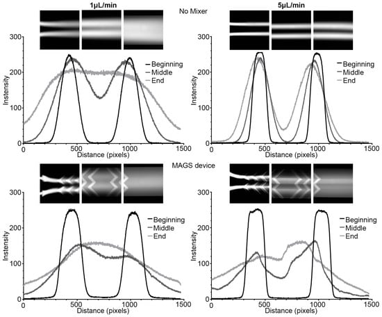 Experimental intensity plots for “No Mixer” and MAGS devices at 1.0 and 5.0 μL/min. The images used to obtain line plots are above each plot and data were extracted using ImageJ. Images were captured at the beginning (Cut-line #1), middle (Cut-line #3), and end (Cut-line #5) of the main channel.