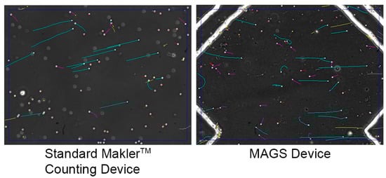 CASA motility tracking results of zebrafish sperm loaded into a Makler® static counting chamber (left) and the MAGS device (right). Images contain sperm tracks from activity.