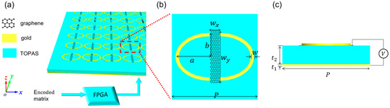 The requirement of achieving multi-bit encoded metasurfaces with phase differences of 180° (1-bit), 90° (2-bit), or 45° (3-bit) between the encoded units is necessary [28]. In this work, a 2-bit metal-graphene metasurface is designed for wavefront modulation, as shown in Figure 1a, featuring a consistent unit structure with each unit possessing a specific phase distribution enabled by the reconfigurable properties of graphene. Figure 1b illustrates the unit structure of the elliptical split-ring resonator (ESRR), composed of two elliptical split metal rings separated by a graphene strip. The major axis (a), minor axis (b), and width (w) of the elliptical split ring are 20 µm, 14 µm, and 2 µm, respectively. The graphene strip has a width of = 6 µm and a length of = 32 µm. The metal–graphene structure is tiled on a reflective gold substrate, with a TOPAS dielectric layer separating them, as depicted in Figure 1c. Both the gold substrate and ESRR have a thickness of = 1 µm, the TOPAS dielectric layer has a thickness of = 9 µm, characterized by a dielectric constant of 2.35, and the electrical conductivity of gold is 4.561 × 107 S/m. In the terahertz and infrared frequency ranges, the electrical conductivity of graphene is primarily attributed to intraband transitions, which can be mathematically expressed by the Kubo formula [25]: