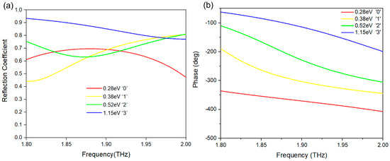 In order to construct a 2-bit encoded metasurface, we designed four highly reflective encoded units with a continuous phase difference of π/2 between each unit. These units were labeled as “0”, “1”, “2”, and “3”, corresponding to their reflection phases of 0°, 90°, 180°, and 270°, respectively. The reflection phase gradients were achieved by carefully setting the Fermi levels of the graphene strips within each unit. Figure 2a,b illustrate the reflection amplitude and phase distributions, respectively, of the four encoded graphene units at different Fermi levels. The phase exhibits continuous variation within the frequency range of 1.8–2 THz, with a coverage range of up to 270°. By selecting specific groups of Fermi levels, we can obtain the desired continuous phase differences at corresponding frequency points. For instance, at 1.86 THz, the phase distribution of the 2-bit encoded metasurface with reflection phases of 0°, 90°, 180°, and 270° can be achieved by applying Fermi levels of 0.28 eV, 0.38 eV, 0.52 eV, and 1.15 eV to the graphene strips of the four encoded units, respectively.