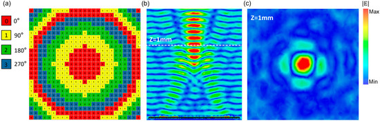 (a) Schematic diagram of encoded metamirror: (b) electric field distribution in the X = 0 mm plane; (c) electric field distribution in the Z = 1 mm plane.