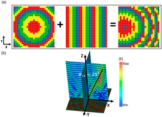 Schematic diagram of the metamirror constructed by superimposed encoded sequences of Sx3 (a) and corresponding electric field distributions (b).