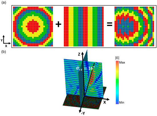 Furthermore, the focus position of the aforementioned metasurface can be flexibly deflected along the X- or Y-axis based on the principle of convolution [40]. As shown in Figure 4, by applying encoded sequences Sx2 (0°-0°-90°-90°-180°-180°-270°-270°...) in the X direction, which corresponds to reconstructing the metamirror by superimposing the designed Sx2 gradient sequence onto the initial encoded metasurface, the focus position is modified. Figure 4b demonstrates a 25° shift of the reflected electric field focus along the X-axis. According to the electromagnetic field theory, the electric field distribution on the metasurface and far-field scattering patterns of the reconstructed metamirror follow the Fourier transform, and the encoded sequences can be predesigned using Fourier convolution. Similarly, in Figure 5a, when the Sx3(0°-0°-0°-90°-90°-90°-180°-180°-180°-270°-270°-270°...) encoded sequences are superimposed on the same original metamirror, the focus position is shifted by 16° along the X-axis (Figure 5b). According to Equation (2), the reflection angles of the two reconstructed metamirrors can be theoretically calculated as and , respectively. The consistency between the simulated and calculated results indicates that the focus position of the presented encoded metamirror can be accurately controlled by superimposing encoded sequences onto it. The complex hybrid encoded sequences obtained by multiple superimposing encoded gradient sequences enable more precise control of the focal point deflection. The range of focal point deflection in the one-dimensional direction is 3.8°–53°. Taking the encoded sequences Sx2 and Sy3 as examples, the range of focal point deflection in the one-dimensional direction is 3.8°–53°, and the encoded matrix is represented as follows: