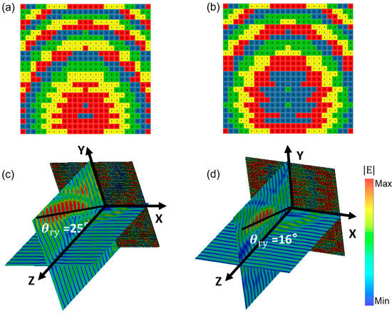 By superimposing encoded sequences in the Y direction, the focus can also be shifted along the Y-axis direction, as demonstrated in Figure 6. Figure 6a,b present the schematic diagrams of the reconstructed metamirror superimposed with encoded sequences Sy2 and Sy3, respectively. The corresponding reflected electric field distributions of the reconstructed metamirror are shown in Figure 6c,d. As anticipated, these distributions indicate that the focus has deviated from the Z-axis by 25° and 16° in the Y-axis direction, respectively.