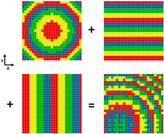 Schematic diagram of the 2D encoded metamirror, with Sy2 and Sx3 encoded sequences, superimposed simultaneously.