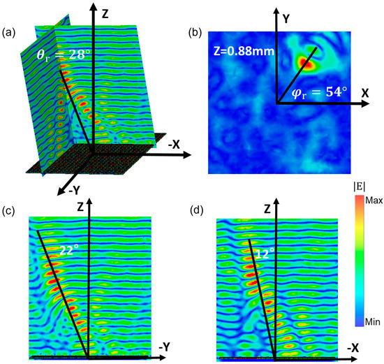 Electric field of the encoded metamirror: (a) pitch angle; (b) azimuth angle; and the corresponding electric fields on (c) Y–Z plane; (d) X–Z plane.