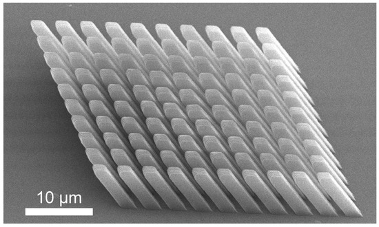 - Lemma, E.D.; Rizzi, F.; Dattoma, T.; Spagnolo, B.; Sileo, L.; Qualtieri, A.; De Vittorio, M.; Pisanello, F. Mechanical properties tunability of three-dimensional polymeric structures in two-photon lithography. IEEE Trans. Nanotechnol. 2016, 16, 23–31. [Google Scholar] [CrossRef]