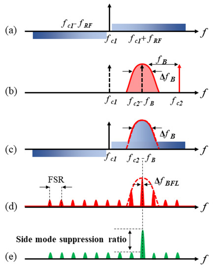 Figure 2 demonstrates the schematic of the filtering process principle of the proposed MPF. The RF sweep signal output by vector network analyzer (VNA) is applied to the phase modulator (PM, ixblue MPZ-LN-20) to achieve double sideband modulated (DSB) of the optical carrier, whose frequency is . Figure 2a displays the spectrum of DSB modulated signal. Then, the upper sideband and the lower sideband − are entered in the Brillouin laser resonator with optical carriers by the coupler OC1 (OC1, 50:50).