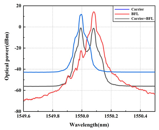 Next, we conducted experimental verification based on the above theories. Firstly, before conducting filtering performance testing, we conducted preliminary tests on the spectra of the pump light injected into the 5 km SMF, the spectra of the Brillouin Stokes light of fiber ring resonater (without PT symmetric system), and the spectra of the mixed light of Brillouin Stokes and optical RF signals. The comparison results of spectral measurements are shown in Figure 3. We set the initial wavelength of the pump light (NKT2) to 1550.00 nm, as shown by the blue line in the spectral comparison diagram. By adjusting the amplification power of EDFA until the stokes spectrum appears on OSA. When the amplification power of EDFA is 21 dBm, the stokes spectrum output by the fiber ring oscillator is shown by the red line in Figure 3, with a wavelength of approximately 1550.08 nm. Obviously, it can be concluded that the difference between the pump light wavelength and the stokes wavelength is 0.08 nm, which is corresponding to a frequency shift of approximately 10 GHz in the frequency domain. This result is basically consistent with the magnitude of Brillouin frequency shift in standard single-mode fibers and indicates that SBS is excited inside the fiber at this time. When the PM modulates the RF sweep signal emitted by VNA to the optical carrier and injects it into the Brillouin resonator, the mixed light of the SBS spectrum and DSB modulated optical signal are displayed in black lines in Figure 3, which demonstrated dual wavelength characteristics on the spectrogram. The left beam is the optical carrier output spectrum of NKT1, and the Brillouin laser spectrum of the composite resonator (as shown in the light blue marked area in Figure 1, a ring resonator with a cascaded PT symmetric system) is on the right side of the beam.