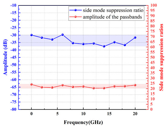 Figure 7 shows that the MPF responses at different center frequencies during the process of changing the laser wavelength (i.e., pump wavelength) of the lower branch in Figure 1 from 1549.9200 to 1550.0800 nm. The image shows that the central frequency tuning interval of the filter is approximately 2 GHz, which can be stably tuned from 0 Hz to 20 GHz. Obviously, the passband side mode of MPF based on PT symmetric Brillouin laser is significantly suppressed. Figure 8 shows the out of band suppression ratio and amplitude of MPF at various center frequencies, demonstrating the stability and ability to suppress sidebands of MPF. The side mode suppression ratio measured within the tuning range are 24.1, 20.6, 21.1, 23.3, 21.6, 22.0, 20.4, 20.4, 22.2, 22.3, and 23.4 dB, respectively, with fluctuations of less than 3.7 dB. The measured amplitude of the MPF passband based on PT symmetry Brillouin laser in the tuning range are −30.0, −32.0, −33.0, −30.0, −36.4, −36.0, −35.5, −39.1, −34.7, −36.6, and −31.6 dB, respectively, with fluctuations less than 9.1 dB. Two curves indicate that the MPF raised in this paper has higher frequency selectivity and good stability. The sensitivity of the SBS effect to changes in strain and temperature is the main reason for this fluctuation. In addition, the coupling efficiency between the Brillouin laser in the resonant cavity and the signal optical carrier can also cause peak fluctuations in the filtering passband. In the experiment, fluctuations caused by the above reasons can be reduced by controlling the ambient temperature and adjusting the resonant cavity PC.