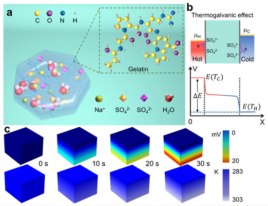 Thermogalvanic hydrogels have shown promise in utilizing liquid electrolytes containing redox couples such as Fe, Fe(CN) and Co(bpy)Cl, which exhibit a relatively high thermoelectric power of several mV·K in the presence of a temperature gradient [38]. Figure 1a illustrates a schematic diagram of the exemplary gel. Here, the redox couple of SO is chosen as the thermogalvanic ions because it is free of heavy metal ions that are harmful to humans.