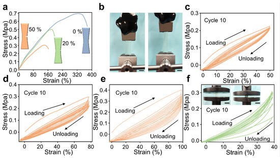 Mechanical properties of Gel-SO gel. (a) Stress–strain curves for different notch sizes (T = 298 K). (b) Physical photo of the tensile strength test. (c–e) Compression of the PG gel was performed at room temperature with 3 different degrees of repetitive tensile curves (T = 298 K). (f) Cyclic loading–unloading curves of hydrogel at a compression strain of 40%; the insets show a photograph of the hydrogel under compression.
