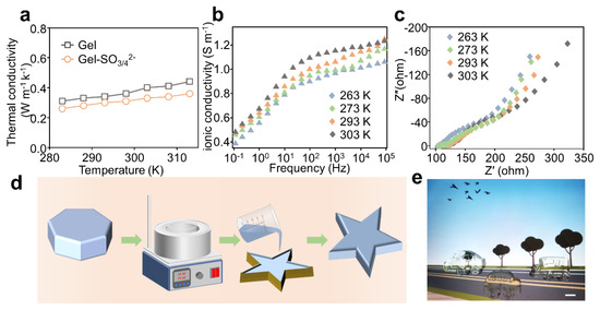 Thermal conductivity, electrical conductivity and recastability of Gel-SO gel. (a) Thermal conductivity of Gel-SO gels with and without SO. (b) Frequency dependence of Gel-SO gel conductivity at different temperatures. (c) EIS spectra with different temperature. (d) Gel-SO gel remelt, recast schematic. (e) Physical photograph of Gel-SO gel being recast in the shape of small cars.