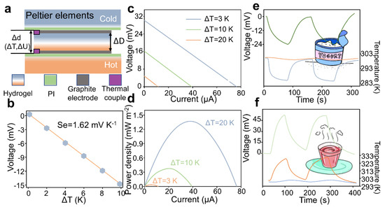 Thermoelectric properties of the thermogalvanic gel. (a) Schematic image of the platform for thermopower measurements. (b) Temperature–voltage curves under different temperature difference conditions. (c,d) Current–voltage curves and the corresponding power densities of the Gel-SO gel thermogalvanic cell at different temperatures. The temperature at one end was fixed at T = 293 K and = . (e,f) Gel-SO gel is used to monitor the temperature of food; (e) cold food; (f) hot food.