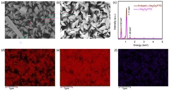Figure 1a,b, respectively, shows a surface morphology picture of an undoped α-Ga2O3 nanorod array/FTO and Al-doped α-Ga2O3 nanorod array/FTO structure by SEM. From the surface morphology images, the Al-doped α-Ga2O3 nanorod in Figure 1b also exhibits a diamond-like shape, which is similar to the α-Ga2O3 nanorod array without doping, as shown in Figure 1a. Therefore, Al doping did not obviously change the surface morphology of the α-Ga2O3 nanorod. As seen in Figure 1c, the EDS measurement obviously indicates the two dominated peaks at 0.52 keV and 1.11 keV for the undoped α-Ga2O3 nanorod array which, respectively, stand for the O and Ga elements. For the Al-doped α-Ga2O3 nanorod array, another EDS peak at 1.49 keV was also observed, corresponding to Al element. The EDS results also indicate an atom ratio of 5.57:1 for Ga: Al in the Al-doped α-Ga2O3 nanorod array. To further evaluate the element distributions in the Al-doped α-Ga2O3 nanorod array, Figure 1d–f are, respectively, the EDS mapping pictures of O, Ga, and Al element distributions in the Al-doped α-Ga2O3 nanorod array, in detail. From Figure 1d–f, O, Ga, and Al elements are uniformly distributed in the Al-doped α-Ga2O3 nanorod array. As a result, Al was successfully and uniformly doped into α-Ga2O3 nanorods.