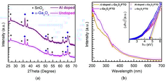 (a) XRD of an undoped α-Ga2O3 nanorod array/FTO (Undoped) and Al-doped α-Ga2O3 nanorod array/FTO (Al doped). (b) UV-vis diffuse reflectance absorption spectra of the undoped α-Ga2O3 nanorod array/FTO and Al-doped α-Ga2O3 nanorod array/FTO. The inset is the plots of (αhν)2 vs. hν.