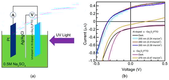 Figure 3a schematically illustrates the measurement setup during UV photodetection, where the undoped α-Ga2O3 nanorod array/FTO or Al-doped α-Ga2O3 nanorod array/FTO were selected as a photoanode in the shown PEC cell. Based on an electrochemical workstation, the three-electrode system additionally consists of Pt (counter electrode) ang Ag/AgCl (reference electrode). A total of 0.5 M Na2SO4 aqueous solution was used as the electrolyte. UV light was illuminated on the surface of the undoped α-Ga2O3 nanorod array/FTO or Al-doped α-Ga2O3 nanorod array/FTO, to evaluate the photoresponse properties. When the spectral responsivity was collected, the undoped α-Ga2O3 nanorod array/FTO or Al-doped α-Ga2O3 nanorod array/FTO, and Pt electrodes were connected with a lock-in amplifier.