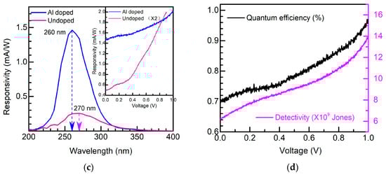 Figure 3b shows the dark current and light current of an undoped α-Ga2O3 nanorod array/FTO device under 270 nm (0.47 mW/cm2) UV light illumination, and the dark and light currents under 255 nm (0.24 mW/cm2), 260 nm (0.31 mW/cm2), and 265 nm (0.39 mW/cm2) UV light illumination of an Al-doped α-Ga2O3 nanorod array/FTO device. The light current increases from −0.17 mA to −0.08 mA at 0 V (vs. Ag/AgCl) under 270 nm illumination for the undoped α-Ga2O3 nanorod array/FTO device. Obviously, the light current of the Al-doped α-Ga2O3 nanorod array/FTO device increases from −0.18 mA to 0.34 mA at 0 V (vs. Ag/AgCl) under 255 nm illumination, from −0.18 mA to 0.35 mA at 0 V (vs. Ag/AgCl) under 260 nm illumination, and from −0.18 mA to 0.33 mA at 0 V (vs. Ag/AgCl) under 265 nm illumination. And larger net photocurrent was realized after Al was doped into the α-Ga2O3 nanorod array. The net short-circuit photocurrent produced at 0 V (vs. Ag/AgCl) indicates that our devices can realize the self-powered photodetection for both the undoped α-Ga2O3 nanorod array/FTO device and the Al-doped α-Ga2O3 nanorod array/FTO device. Additionally, the open-circuit voltage is estimated to be ~−0.3 V under 255 nm illumination, ~−0.33 V under 260 nm illumination, and ~−0.33 V under 265 nm illumination for the Al-doped α-Ga2O3 nanorod array/FTO device. Considering the undoped α-Ga2O3 nanorod array/FTO and Al-doped α-Ga2O3 nanorod array/FTO structure as photoanodes, the light current shifting towards the positive direction compared with the negative dark current indicates that positive photocurrent has been generated. Thus, the photogenerated electrons flows from undoped α-Ga2O3 nanorod array or Al-doped α-Ga2O3 nanorod array to FTO in the undoped α-Ga2O3 nanorod array/FTO or Al-doped α-Ga2O3 nanorod array/FTO device at 0V (vs. Ag/AgCl). The detailed mechanism will be explained in the working mechanism part. Figure 3c shows solar-blind UV photoresponse spectra at 0 V (vs. Ag/AgCl). The peak wavelength is ~270 nm, with a peak responsivity of ~0.25 mA/W for the undoped α-Ga2O3 nanorod array/FTO device, while the peak wavelength is 260 nm with a peak responsivity of ~1.46 mA/W for the Al-doped α-Ga2O3 nanorod array/FTO device. Because of the larger optical bandgap of the Al-doped α-Ga2O3 nanorod array, the peak photoresponse shifts to the shorter wavelength, which is consistent with the slight blue-shift property of the Al-doped α-Ga2O3 nanorod array in the solar-blind UV region in Figure 2b. And the enhanced responsivity is also related to Al doping. According to the literature, the photoresponse of Ga2O3 can be improved after Al doping, although further investigations should be conducted to reveal the reason [,,,,]. Herein, the Al-doped α-Ga2O3 nanorod array is also ~5.84 times larger in peak responsivity than the undoped α-Ga2O3 nanorod array at 0 V (vs. Ag/AgCl). The inset of Figure 3c shows the peak responsivity of the undoped α-Ga2O3 nanorod array/FTO device and Al-doped α-Ga2O3 nanorod array/FTO device varying with the applied voltages (vs. Ag/AgCl). The peak responsivity increases from ~0.25 mA/W at 0 V to 1 mA/W at 0.9 V for the undoped α-Ga2O3 nanorod array/FTO device. Obviously, the peak responsivity increases from ~1.46 mA/W at 0 V to 2.02 mA/W at 1 V for the Al-doped α-Ga2O3 nanorod array/FTO device, which is much larger than that of the undoped device. Based on the responsivity and dark current, the quantum efficiency and detectivity of the Al-doped α-Ga2O3 nanorod array/FTO device can be roughly evaluated []. Figure 3d shows the voltage dependences of the calculated quantum efficiency and detectivity in details. The quantum efficiency varies from ~0.7% at 0 V (vs. Ag/AgCl) to ~0.96% at 1 V (vs. Ag/AgCl), while the detectivity increases from ~6 × 109 Jones at 0 V (vs. Ag/AgCl) to ~1 × 1010 Jones at 1 V (vs. Ag/AgCl). The enhanced responsivity, quantum efficiency, and detectivity are ascribed from the wider depletion region when positive voltages are added to the FTO electrode.