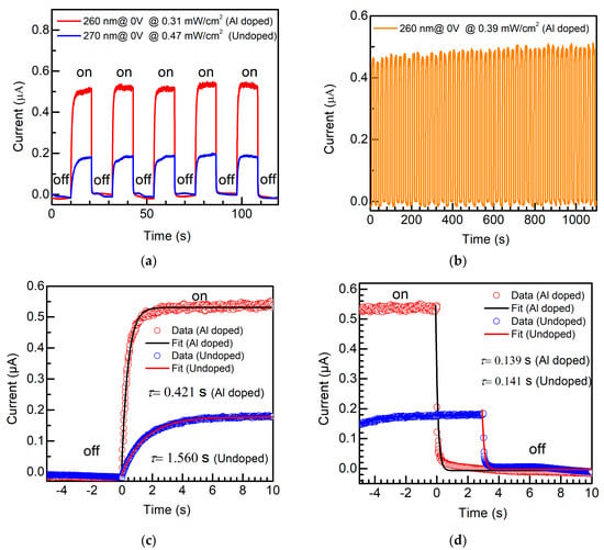 (a) Time-dependent current of an undoped α-Ga2O3 nanorod array/FTO device (Undoped) under 270 nm light illumination (0.47 mW/cm2), and Al-doped α-Ga2O3 nanorod array/FTO device (Al doped) under 260 nm light illumination (0.31 mW/cm2), in 5 cycles, with 10 s on and 10 s off. (b) Time-dependent current of the Al-doped α-Ga2O3 nanorod array/FTO device in 50 cycles, with 10 s on and 10 s off, under 260 nm light illumination (0.39 mW/cm2). (c) Transient photoresponse curves of the α-Ga2O3 nanorod array/FTO device (Undoped), and Al-doped α-Ga2O3 nanorod array/FTO device (Al doped), during rise processes in (a). (d) Transient photoresponse curves of the α-Ga2O3 nanorod array/FTO device (Undoped), and Al-doped α-Ga2O3 nanorod array/FTO device (Al doped), during decay processes in (a). The α-Ga2O3 nanorod array/FTO device and Al-doped α-Ga2O3 nanorod array/FTO device were performed as photoanodes in a PEC cell at 0 V (vs. Ag/AgCl).