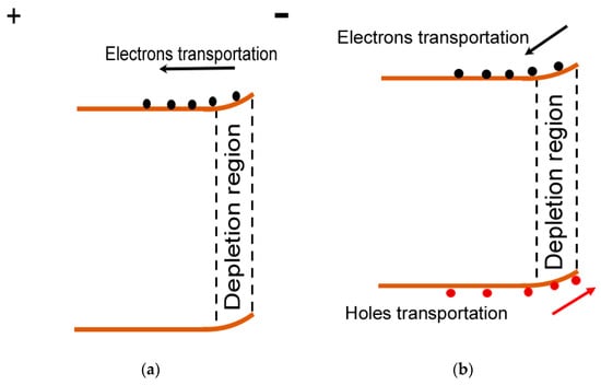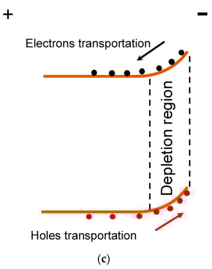 To further explain the working mechanism, Figure 5 schematically depicts energy band diagrams of the undoped α-Ga2O3 nanorod array/FTO device or Al-doped α-Ga2O3 nanorod array/FTO device as a photoanode in the PEC cell. In the dark, a Schottky junction is produced between the nanorod array and Na2SO4 electrolyte when a nanorod array on FTO is immersed into a Na2SO4 aqueous solution in Figure 5a []. Thus, a depletion region is generated at the surface of the nanorod array. Owing to the nanorod array/FTO structure selected as the photoanode; positive biases are added to FTO when the PEC cell works as shown in Figure 5a. Therefore, the forward current in our device is just the reverse current as in the traditional Schottky junction. However, photogenerated electron-hole pairs are produced in the depletion region of the undoped α-Ga2O3 nanorod array or Al-doped α-Ga2O3 nanorod array under solar-blind UV light illumination in Figure 5b,c. Under the drift of the built-in electric field, photogenerated electrons move from the undoped α-Ga2O3 nanorod array or Al-doped α-Ga2O3 nanorod array to FTO, while photogenerated holes moves from the undoped α-Ga2O3 nanorod array or Al-doped α-Ga2O3 nanorod array to the electrolyte. Thus, a large positive photocurrent is generated under solar-blind UV light illumination, the direction of which is the same transportation direction as that of the forward dark current. Thus, the light current shifting towards a positive direction has been observed for both the undoped α-Ga2O3 nanorod array/FTO device and Al-doped α-Ga2O3 nanorod array/FTO devices in Figure 3 and Figure 4. It is noteworthy that the larger bandgap of the Al-doped α-Ga2O3 may lift its conduction edge as the incorporation of MgO into ZnO []. Therefore, a larger Schottky barrier may exist in the Al-doped α-Ga2O3 nanorod array/FTO PEC cell than that in the undoped α-Ga2O3 nanorod array/FTO PEC cell. As a result, a wider depletion region in the Al-doped α-Ga2O3 nanorod array/FTO PEC cell can improve the separation of more photogenerated electron-hole pairs, and contributes to a larger photocurrent and responsivity. Therefore, the larger photocurrent and responsivity have been demonstrated through doping Al into the α-Ga2O3 nanorod array. Generally, the depletion region of a Schottky junction can be enhanced under reverse biases. Considering the undoped α-Ga2O3 nanorod array/FTO or Al-doped α-Ga2O3 nanorod array/FTO as the photoanode in the PEC cell, such biases are the forward biases as indicated in Figure 5a. As a result, the depletion region becomes wider in Figure 5c under positive biases than that at 0 V in Figure 5b. Therefore, larger photocurrent is formed under positive biases, which is also the reason of the improved responsivity, quantum efficiency, and detectivity when positive voltages are added to the FTO electrode, as shown in Figure 3c,d.