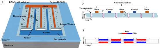 A1 resonators based on LiNbO3 film (including through-holes structure). (a) Global schematic diagram of the resonator. (b) Cross-sectional view of the resonator. (c) Out-of-plane displacement field distribution in the resonator at its resonant frequency.