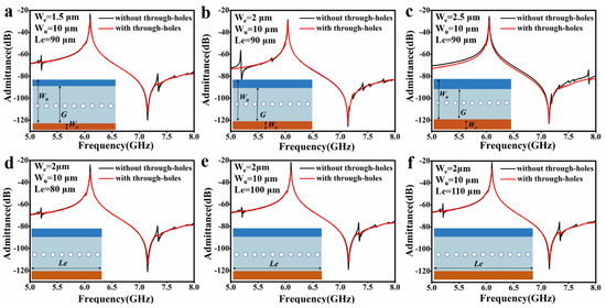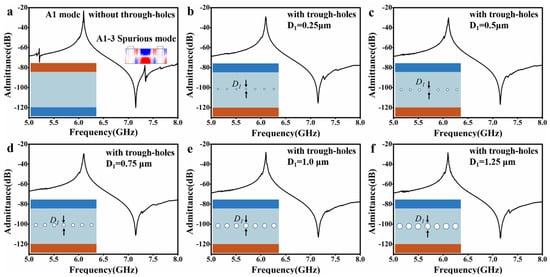 We further studied the spurious modes-suppression on the different spacing of the through-holes, as shown in Figure 3. Take the resonator in Figure 2e; for instance, Figure 3a–f show admittance spectra that the spacing between two adjacent through-holes is 7 μm, 8 μm, 9 μm, 10 μm, 11 μm, and 12 μm, respectively. It can be seen that when the spacing is small, e.g., 7 μm (Figure 3a), the spurious modes are already suppressed quite well, but there is still a little bit. They are completely suppressed with increased spacing, e.g., 8 μm to 10 μm (Figure 3b–d). When the spacing continues to increase, e.g., 11 μm and 12 μm (Figure 3e,f), the spurious mode reappears, but still only a little bit, much better than the situation without through-holes. Also, in these above cases, the A1 resonators’ admittance and the frequencies of the primary mode remain almost the same.
