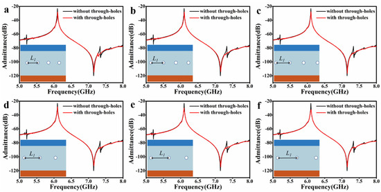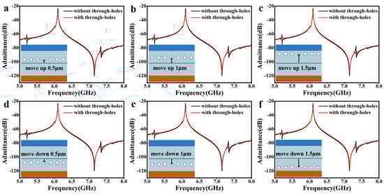 We also studied the influence of the position of the through-holes between the IDT electrodes on the spurious modes-suppression, as shown in Figure 4. Take the same resonator in Figure 2e as an instance, Figure 4a–f show the admittance spectra for the position of the through-holes moved upward by 0.5 μm, 1 μm, 1.5 μm and downward by 0.5 μm, 1 μm, and 1.5 μm, respectively. The results show that as long as the position of the through-holes is among the IDT electrodes, all unwanted spurious modes are completely suppressed.